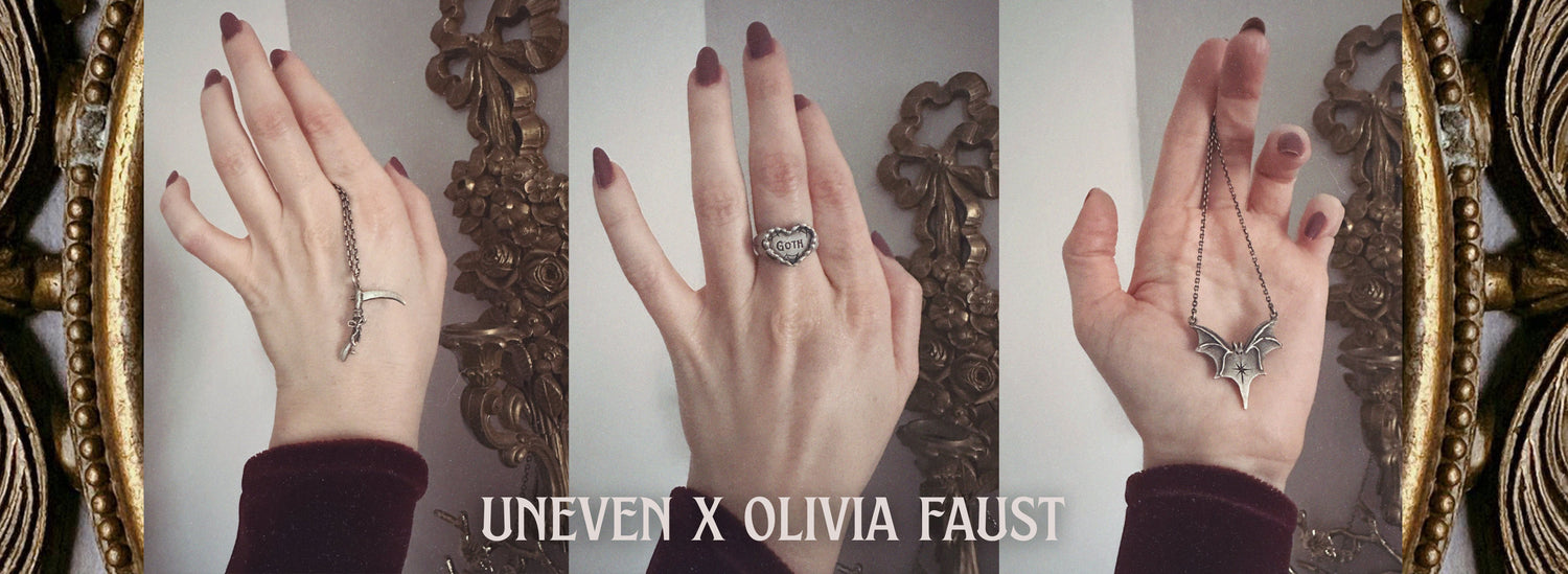 UNEVEN X OLIVIA FAUST: A dark & dreamy jewelry collaboration. Sterling silver pieces created by UNEVEN & inspired by the visual world of Olivia Faust.