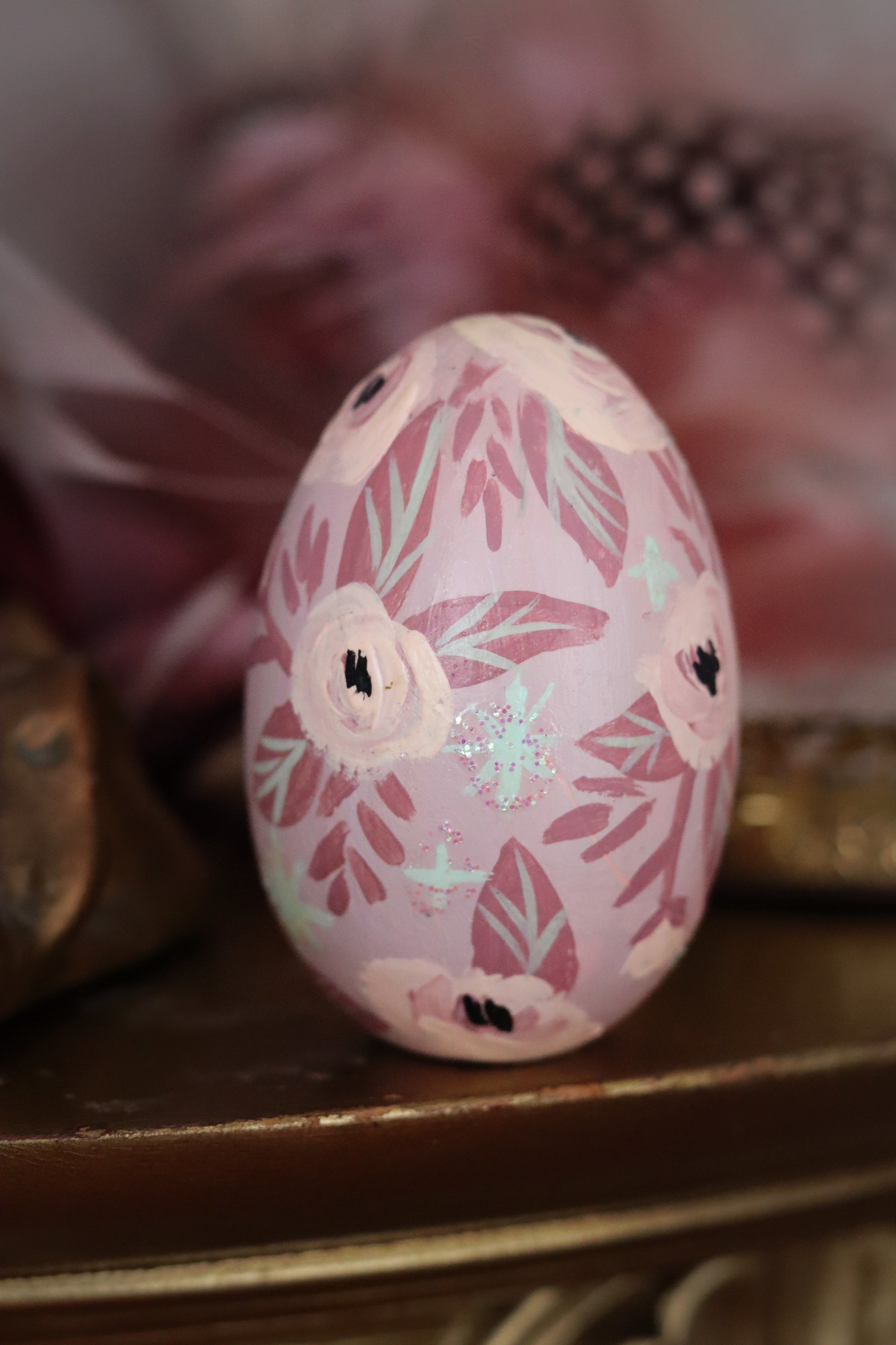 An enchanted solid wooden egg painted with lots of folksy foliage all surrounding a black swan. Small glitter accents can be found throughout.🦢🖤✨