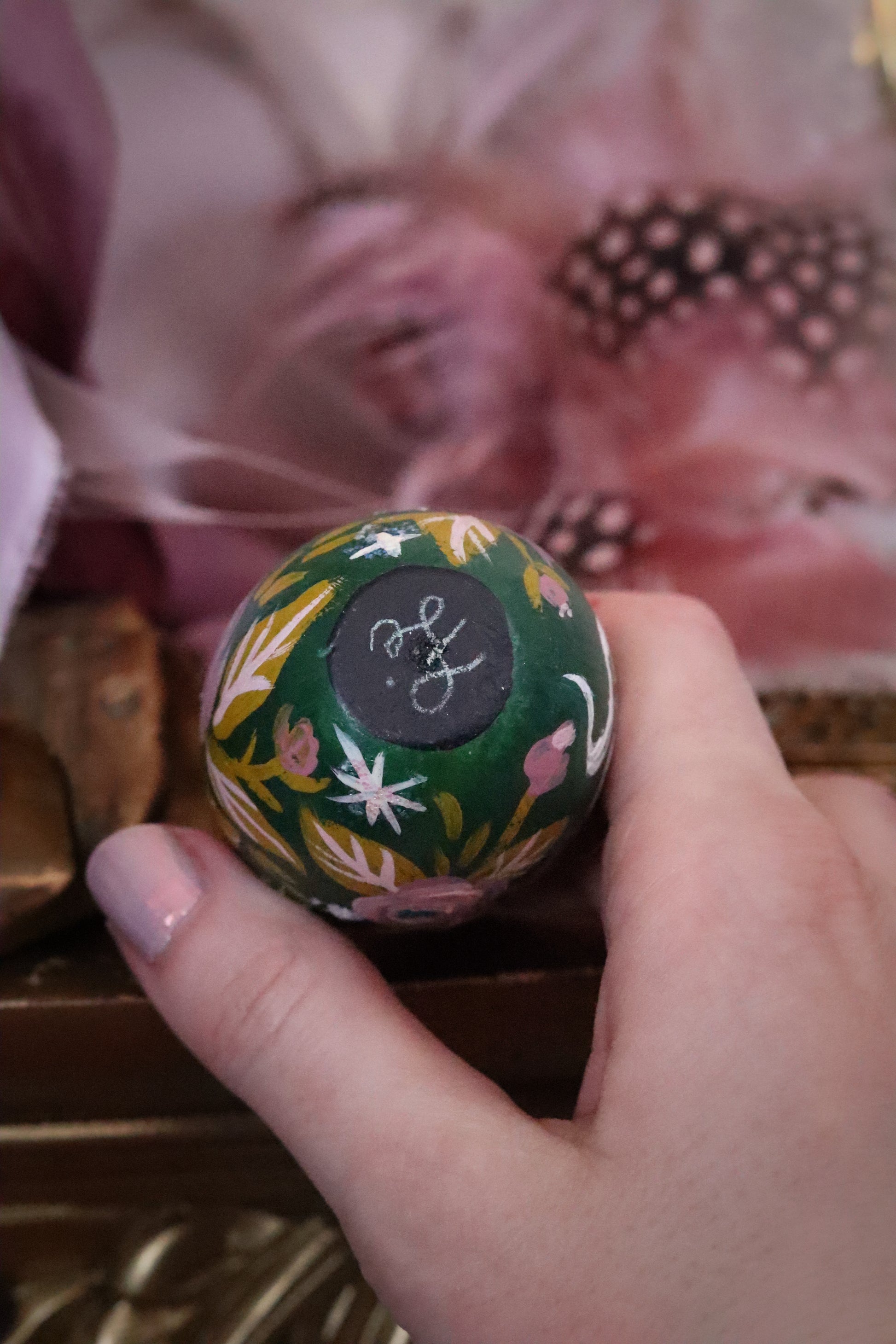 ✦ Signature initials on the bottom of the egg.
