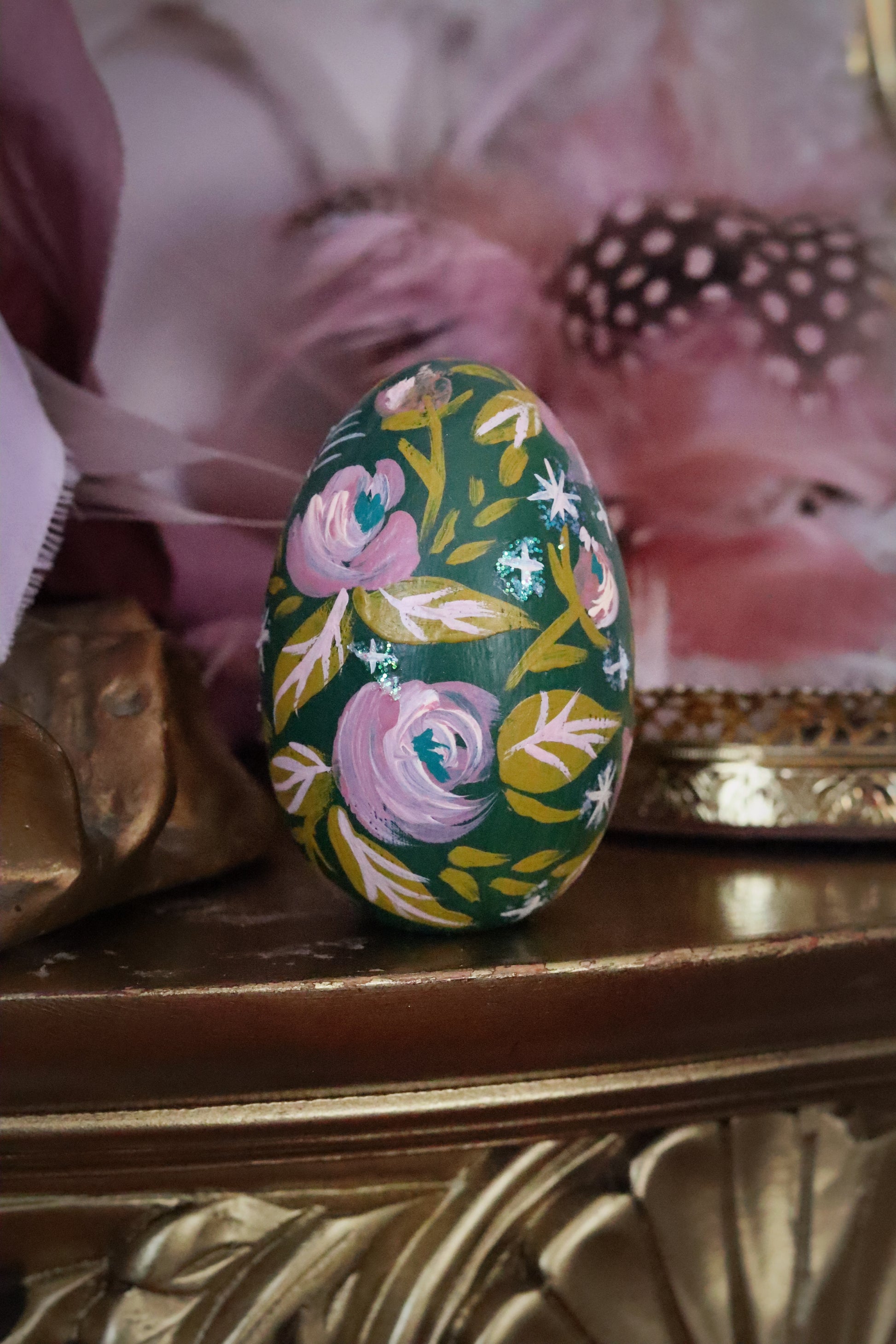 An enchanted solid wooden egg painted with lots of folksy foliage all surrounding a ghost bunny. Small glitter accents can be found throughout.🐇🌷✨