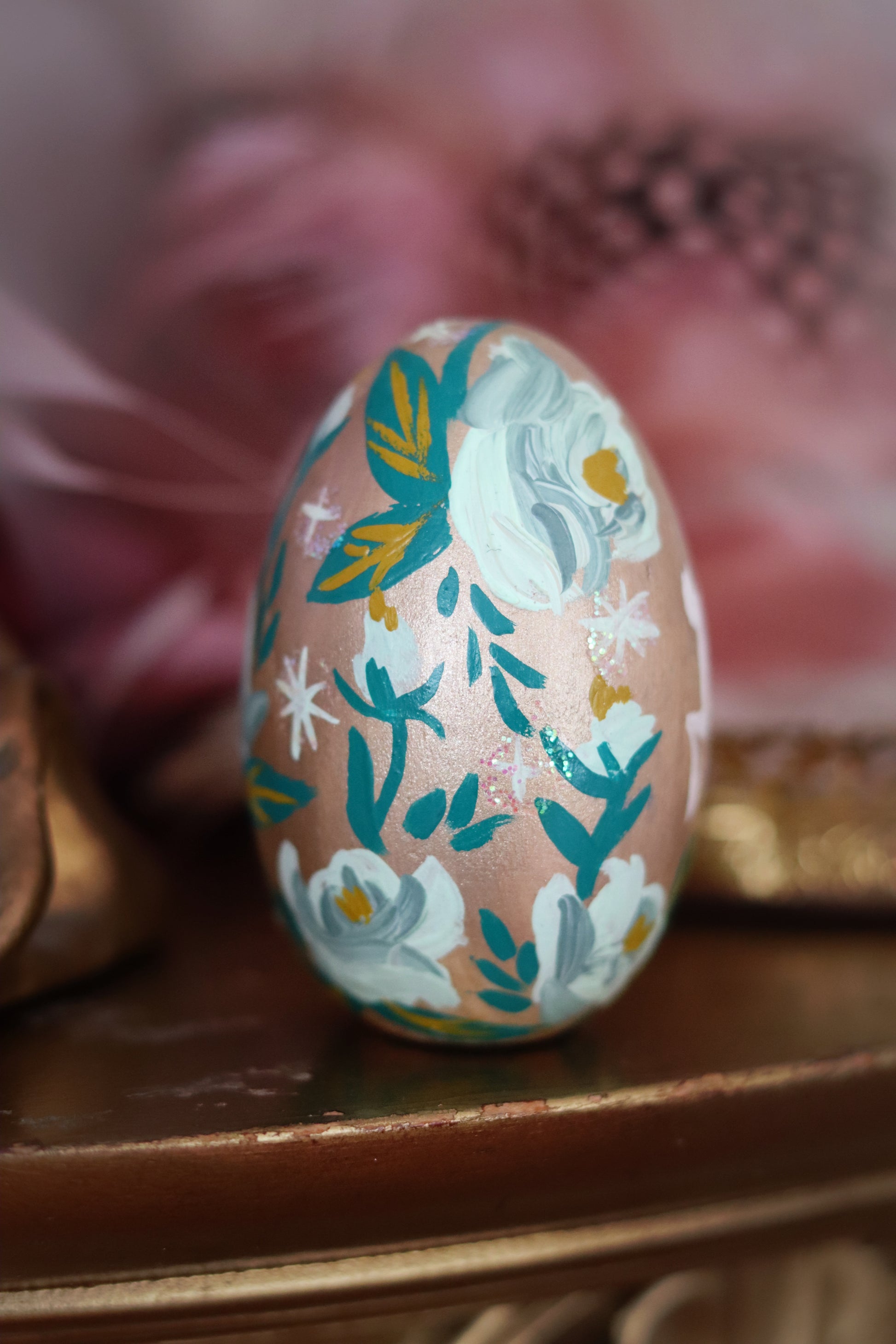 An enchanted solid wooden egg painted with lots of folksy foliage all surrounding a white rabbit. Small glitter accents can be found throughout.🐇🌷✨