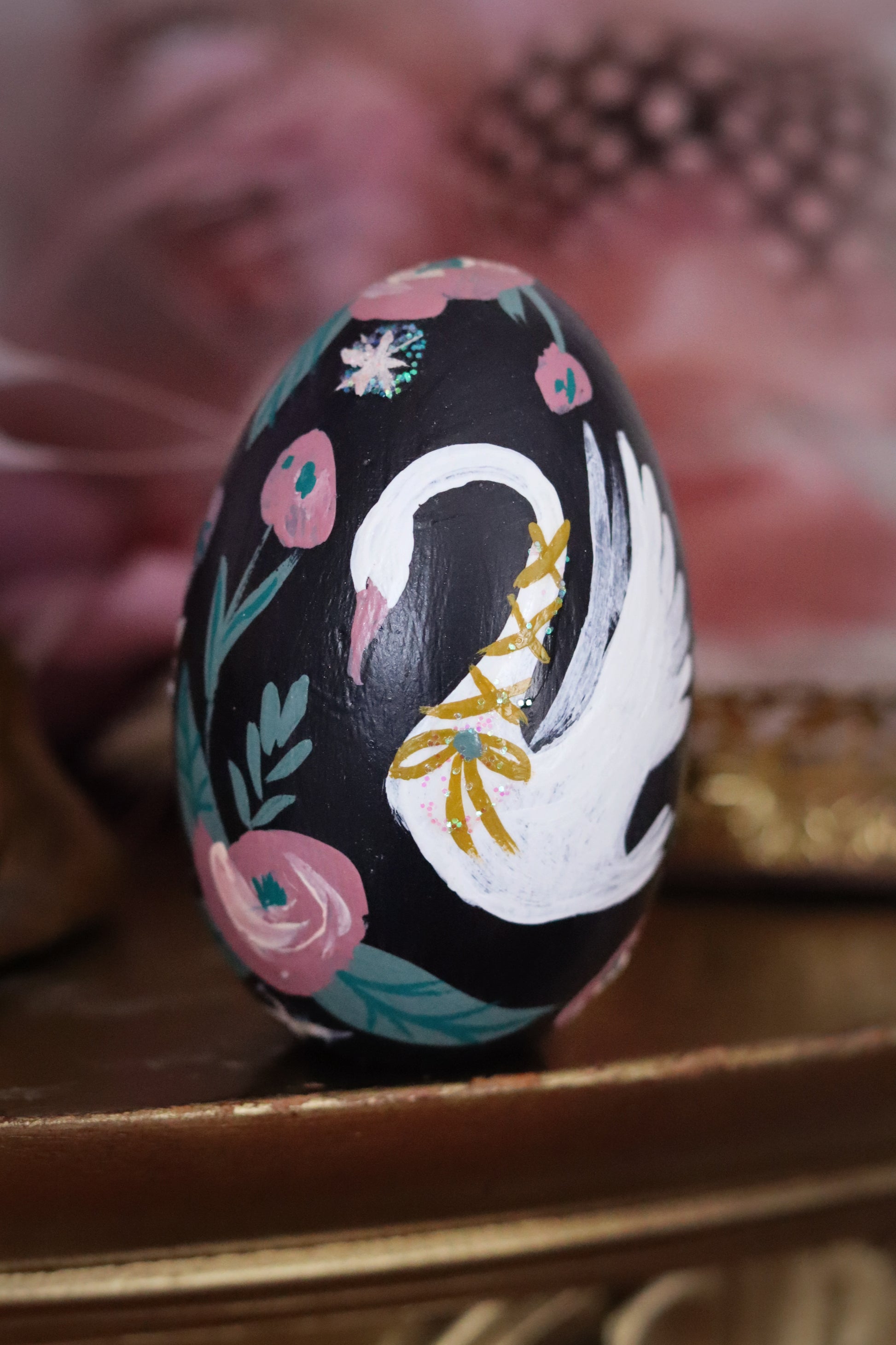 An enchanted solid wooden egg painted with lots of folksy foliage all surrounding a white swan. Small glitter accents can be found throughout.🦢🖤✨